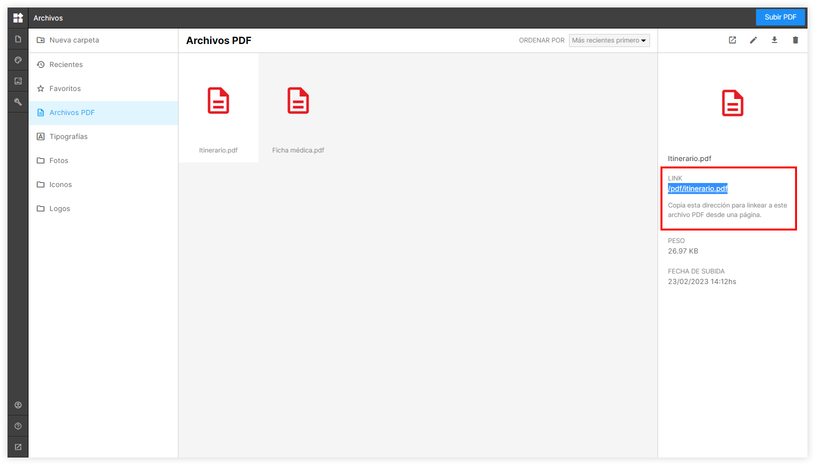 Una vez dentro ingresamos a la carpeta "Archivos PDF" y hacemos clic en el botón "Subir PDF".